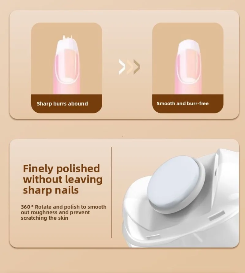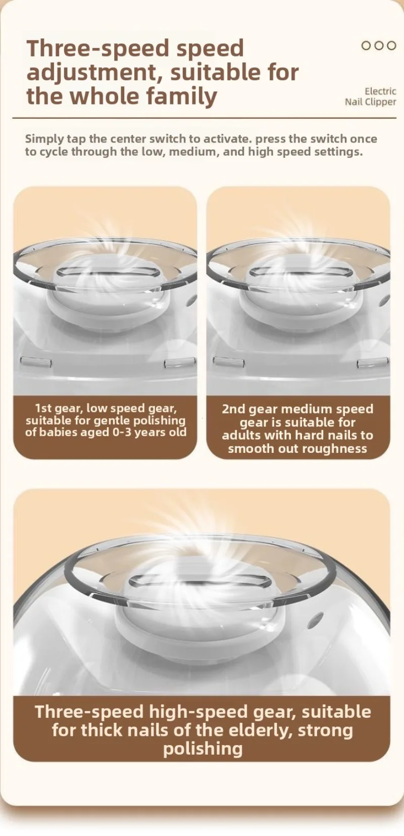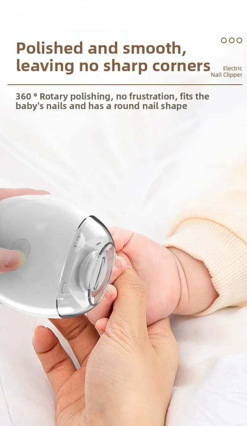 Upgraded electric nail polish Cutting and grinding bright armor safety protection Debris storage High and low speed TYPE-C charging lighting Babies with excessively long nails can easily injure themselves Smooth and delicate polishing 360 ° rotary polishing, no jerking sensation, fits baby's nail shape with rounded nails. Three speed adjustment Easy to operate, suitable for whole family use. First gear: Suitable for 0-3 year old babies to gently polish. Second level: Suitable for adults to polish hard nails. Third gear: suitable for polishing hard and thick nails. Tap the center switch to turn it on. Press the switches in sequence, which are low-speed, medium speed, and high-speed. Light assistance Nail repair and polishing are clearer, making it easy to see details even in dark environments. Transparent storage compartment design Transparent storage compartment design on the head, remove the storage compartment cover to pour out nail shavings. Low noise operation Don't worry about disturbing your baby's sleep or getting scared. Type-C charging interface Full at once, sustainable work for about four hours. Compact and lightweight Can be carried around for more freedom in manicure