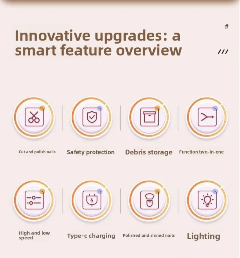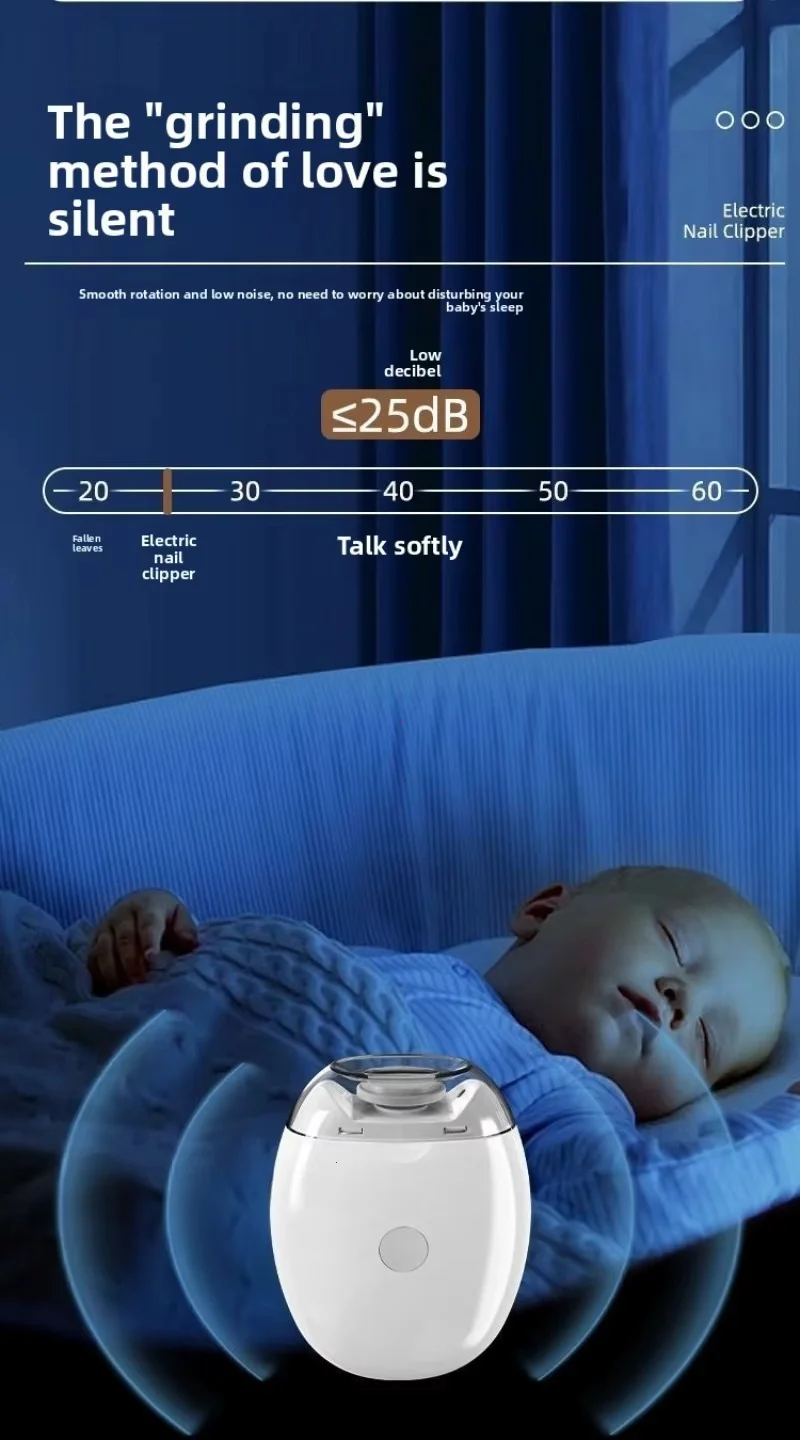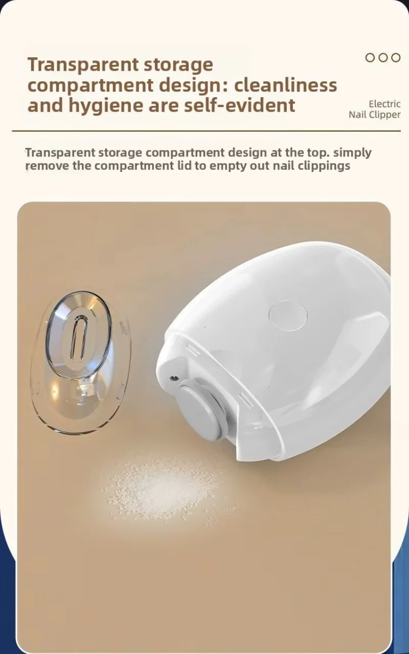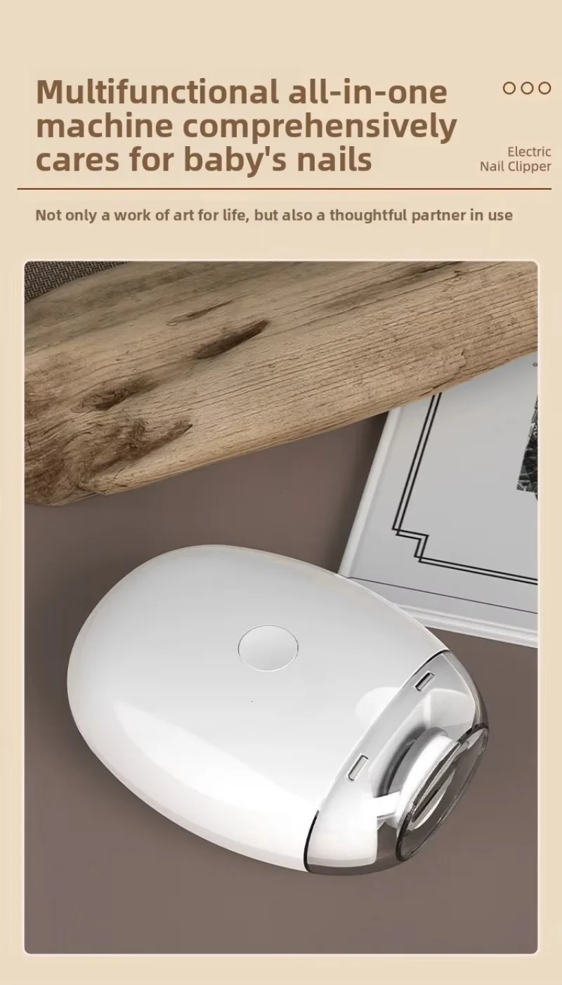 Upgraded electric nail polish Cutting and grinding bright armor safety protection Debris storage High and low speed TYPE-C charging lighting Babies with excessively long nails can easily injure themselves Smooth and delicate polishing 360 ° rotary polishing, no jerking sensation, fits baby's nail shape with rounded nails. Three speed adjustment Easy to operate, suitable for whole family use. First gear: Suitable for 0-3 year old babies to gently polish. Second level: Suitable for adults to polish hard nails. Third gear: suitable for polishing hard and thick nails. Tap the center switch to turn it on. Press the switches in sequence, which are low-speed, medium speed, and high-speed. Light assistance Nail repair and polishing are clearer, making it easy to see details even in dark environments. Transparent storage compartment design Transparent storage compartment design on the head, remove the storage compartment cover to pour out nail shavings. Low noise operation Don't worry about disturbing your baby's sleep or getting scared. Type-C charging interface Full at once, sustainable work for about four hours. Compact and lightweight Can be carried around for more freedom in manicure